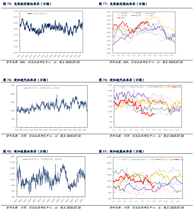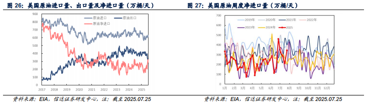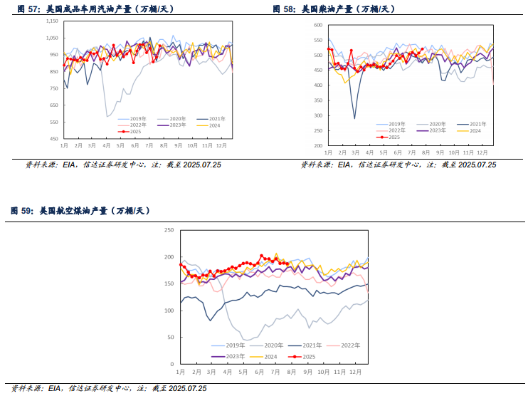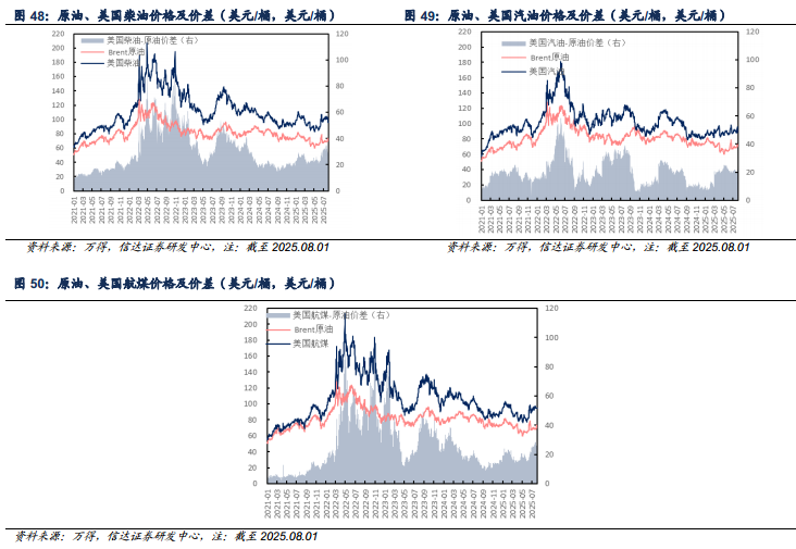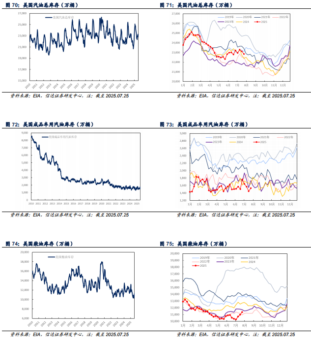 消费方面:截至2025年07月25日当周,美国成品车用汽油、柴油、航空煤油消费量分别为915.2、360.5、209.3万桶/天,较上周分别+18.5(+2.06%)、+26.2(+7.84%)、+41.1(+24.44%)万桶/天。