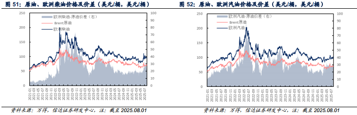 欧洲市场:截至2025年08月01日当周,欧洲柴油、汽油、航煤周均价分别为96.20(-1.70)、100.37(+2.72)、99.07(-2.30)美元/桶;与原油差价分别为25.04(-3.95)、29.21(+0.48)、27.91(-4.54)美元/桶。
