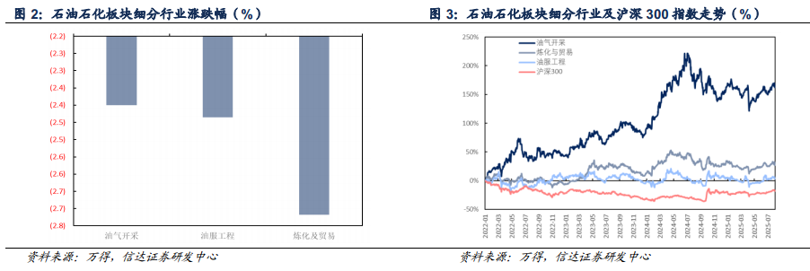 截至2025年8月1日当周,油气开采板块下跌2.40%,油服工程板块下跌2.44%,炼化及贸易板块下跌2.72%。