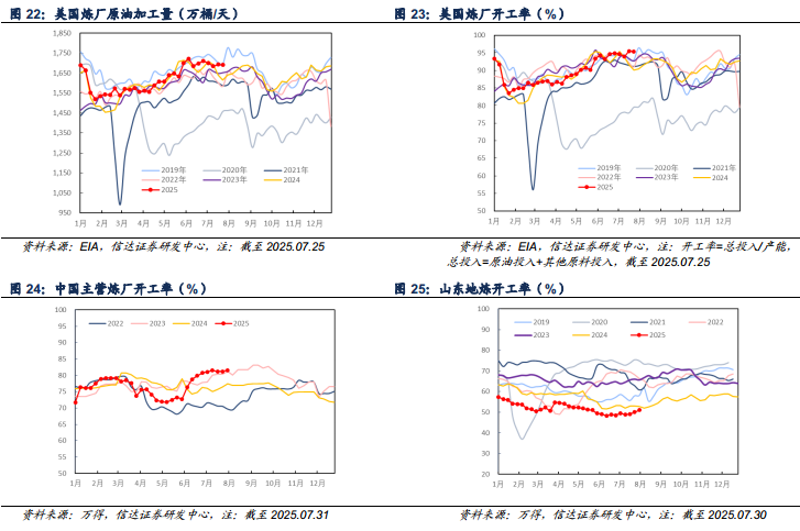 中国炼厂:截至2025年07月31日,主营炼厂开工率为81.55%,较上周上升0.34pct。截至2025年07月30日,山东地炼开工率为50.99%,较上周上升0.95pct。