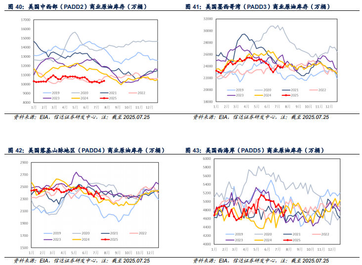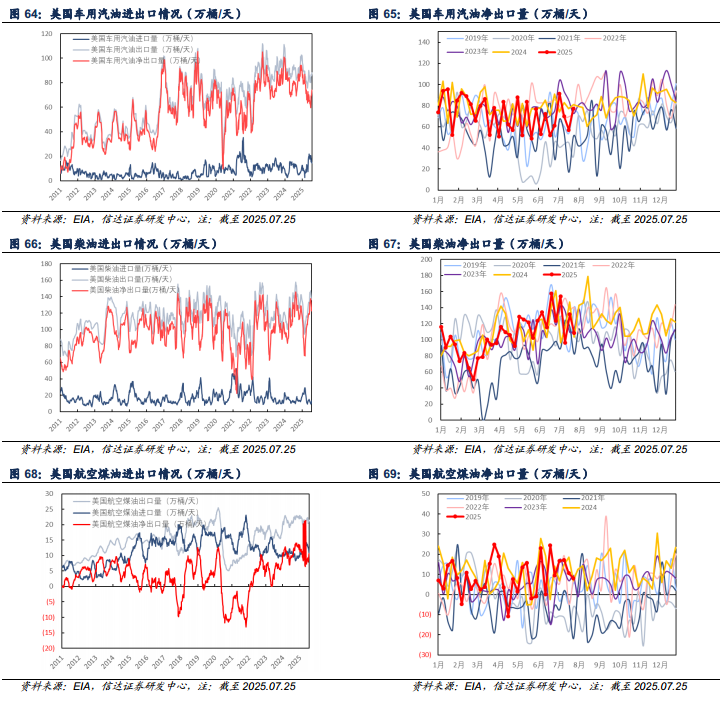 产量方面:截至2025年07月25日当周,美国成品车用汽油、柴油、航空煤油产量分别为1004.2、520.9、187.3万桶/天,较上周分别+67.6(+7.22%)、+13.0(+2.56%)、-1.3(-0.69%)万桶/天。