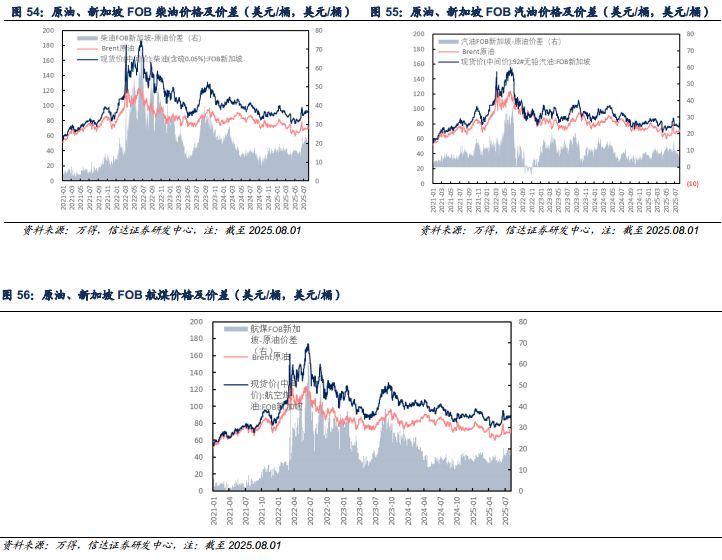 东南亚市场:截至2025年08月01日当周,新加坡柴油、汽油、航煤周均价分别为91.81(+0.04)、77.89(+1.31)、88.08(+0.48)美元/桶;与原油差价分别为20.50(-2.37)、6.74(-0.94)、16.80(-1.89)美元/桶。