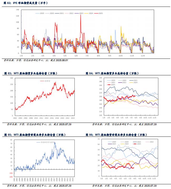 原油期货成交及持仓:截至2025年08月01日,周内布伦特原油期货成交量为129.29万手,较上周减少59.37万手(-31.47%)。截止至2025年07月29日,周内WTI原油期货多头总持仓量为202.89万张,较上周增加1.56万张(+0.77%);非商业(投机和套利目的持有)净多头持仓15.6万张,较上周增加0.27万张(+1.76%)。