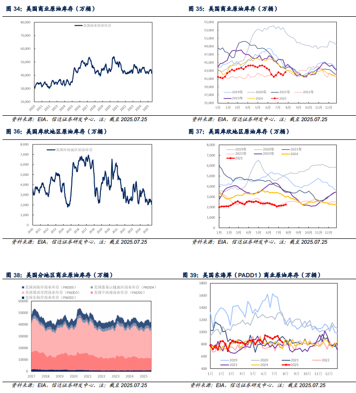 截至2025年07月25日当周,美国原油总库存为8.29亿桶,较上周增加793.6万桶(+0.97%);战略原油库存为4.03亿桶,较上周增加23.8万桶(+0.06%);商业原油库存为4.27亿桶,较上周增加769.8万桶(+1.84%);库欣地区原油库存为2255.3万桶,较上周增加69.0万桶(+3.16%)。